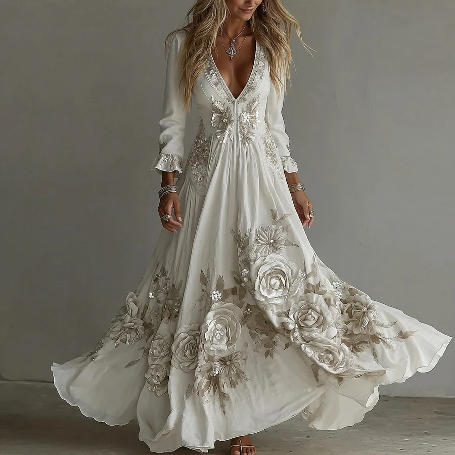 Women's Vintage White Flowers Embroidery Art V-neck Maxi Dress