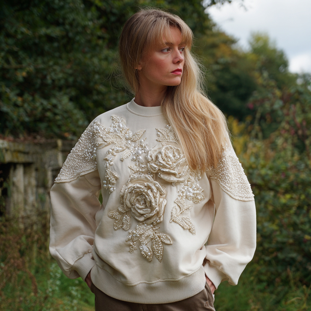 Women's White Rose Embroidery Art Round Neck Casual Sweatshirt